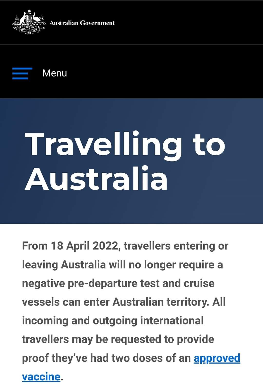 Mulai hari ini, 18 April 2022, para turis atau warga luar Australia yang ingin mengunjungi Australia tidak perlu menunjukkan bukti test covid negative untuk keluar dan masuk Australia. Pemerintah Australia hanya memerlukan bukti vaksin (2 doses of vaccines), dan menggunakan masker saat kedatangan dan selama perjalanan di pesawat.